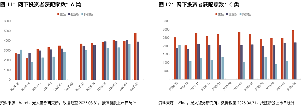 2025年8月,主板采用网下打新的新股1只,上市首日平均涨幅为140.68%,环比-135.61pct,初步询价配售对象为8756家,报价入围率为97.12%,环比+1.45pct;网下中签率分别为A类:0.12‰、C类:0.12‰。
